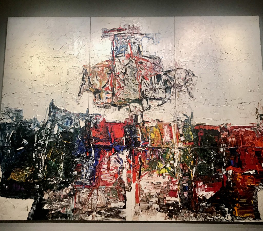 Point de rencontre – Quintette, de 1963, nous attend de pied ferme tout au haut de l’escalier majestueux du musée, mon modeste objectif d’iPhone y perdant son cadre; plus grande oeuvre de Riopelle, une commande pour l’aéroport Pearson de Toronto – Toronto, un mot huron pour point de rencontre. Et ‘quintette’; sûrement pour moi, qui ai dans mes oeuvres préférées plusieurs quintettes…